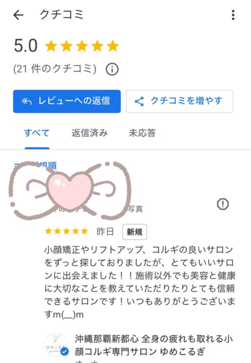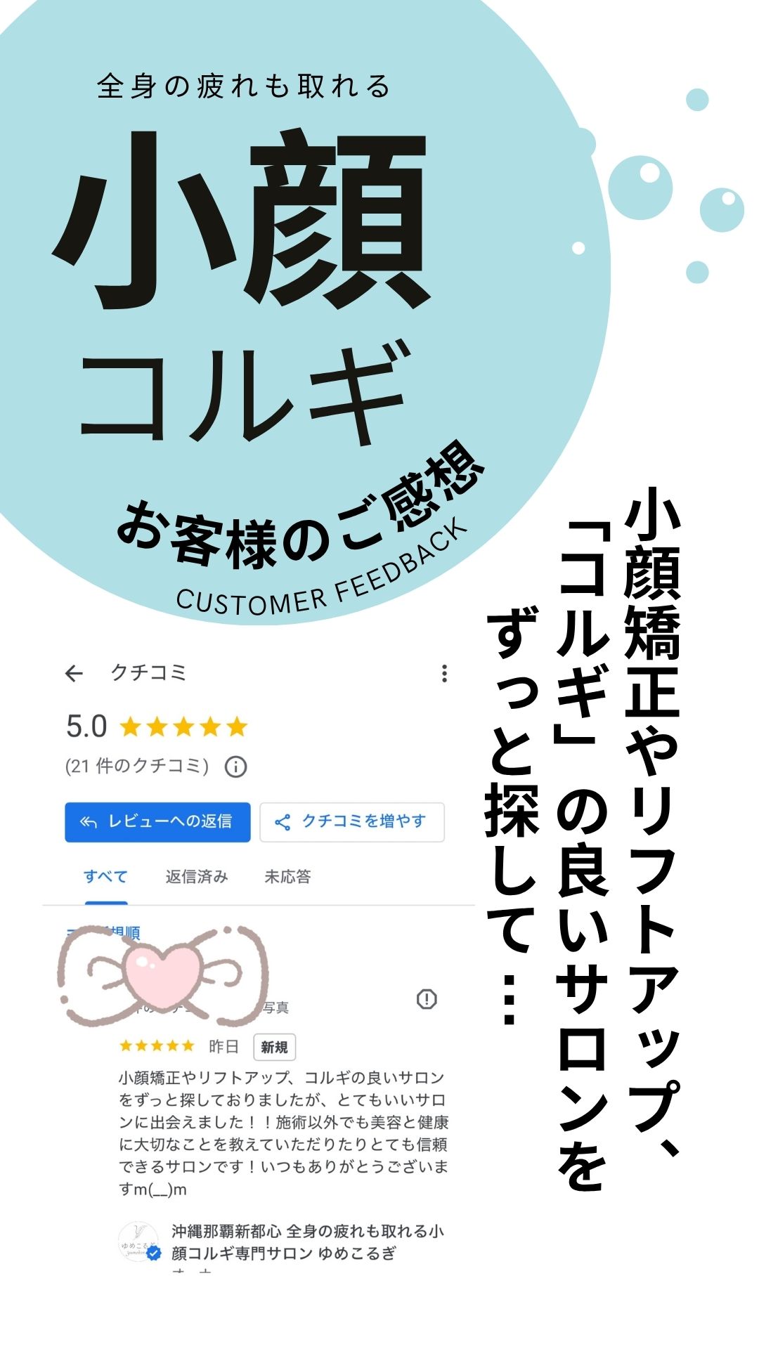 小顔矯正やリフトアップ、コルギの良いサロンをずっと探しておりましたが、とてもいいサロンに出会えました!!施術以外でも美容と健康に大切なことを教えていただりたりとても信頼できるサロンです!いつもありがとうございますm(__)m
