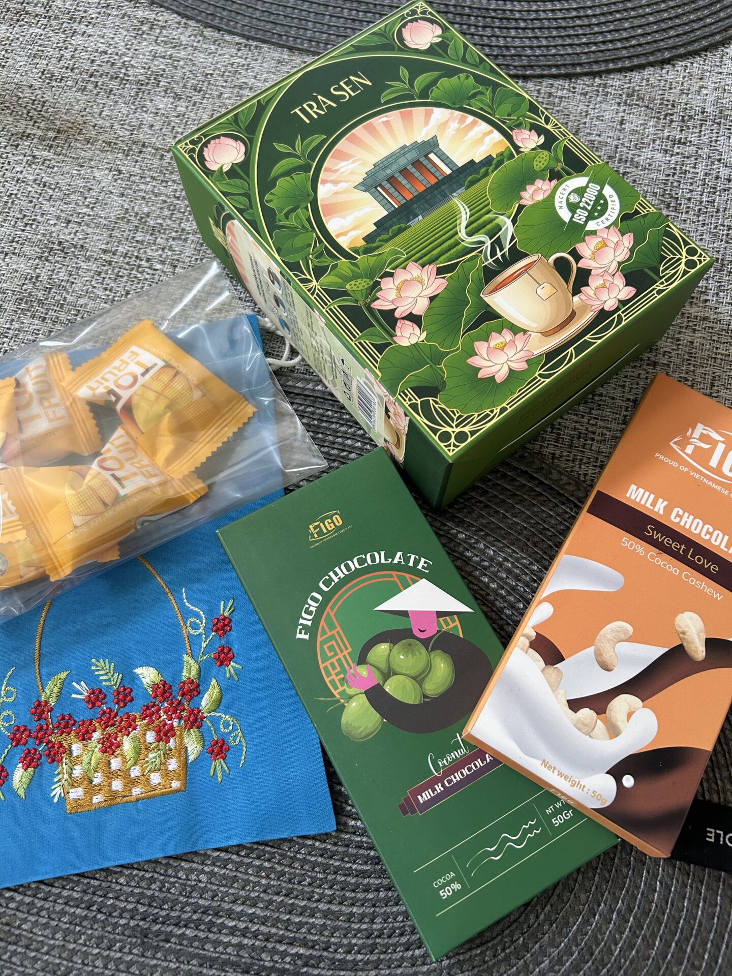 マンゴーのグミと、FIGOのミルクチョコレート、そしてロータスティー(蓮のお茶)です。