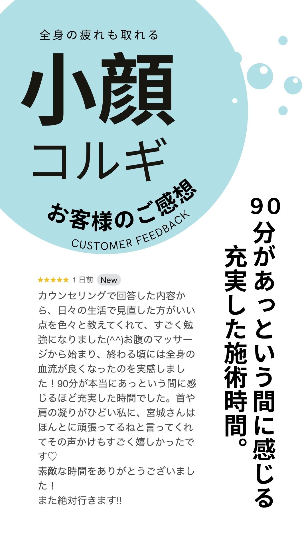 カウンセリングで生活習慣の見直しポイントをお伝えし、お腹のマッサージから全身の血流アップ、そして首・肩こりやお顔のスッキリ感まで。サロンでの90分がどんな時間なのか、イメージしていただけると思います。