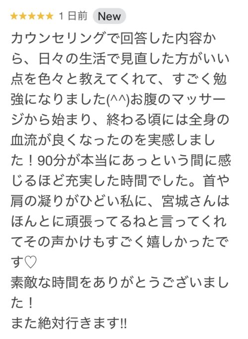 お客様も、「お腹のマッサージから始まり、終わる頃には全身の血流が良くなったのを実感しました!」とおっしゃってくださいました。