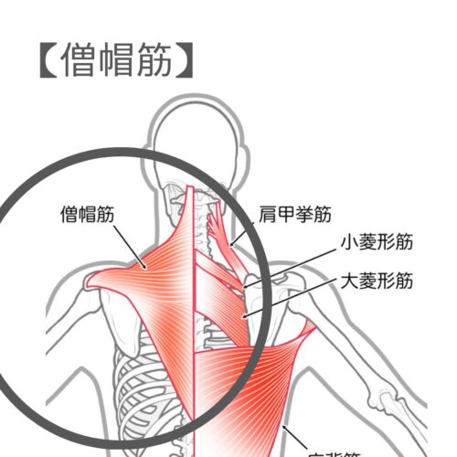 僧帽筋は首〜肩〜背中の上部に広がる大きな筋肉です。